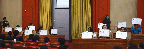 通过前期的宣传及报名,12位选手应邀而“战”。比赛共分为五个环节,诗词填空、解字解句、点字成金、看图写诗、飞花令。从不同角度考察选手们对诗词的熟悉度、语言的理解力、图片的领悟力、想象力及书写的速度和准确率。诗词填空环节,选手们奋笔疾书,比分差距不大,看图写诗环节,选手们凝眉沉思,比分差距逐渐拉开,飞花令环节,选手们激烈比拼,网媒1501牛媛媛同学脱颖而出。大会现场不时掌声阵阵,场上场下气氛活跃,更有多才的观众跃跃一试。