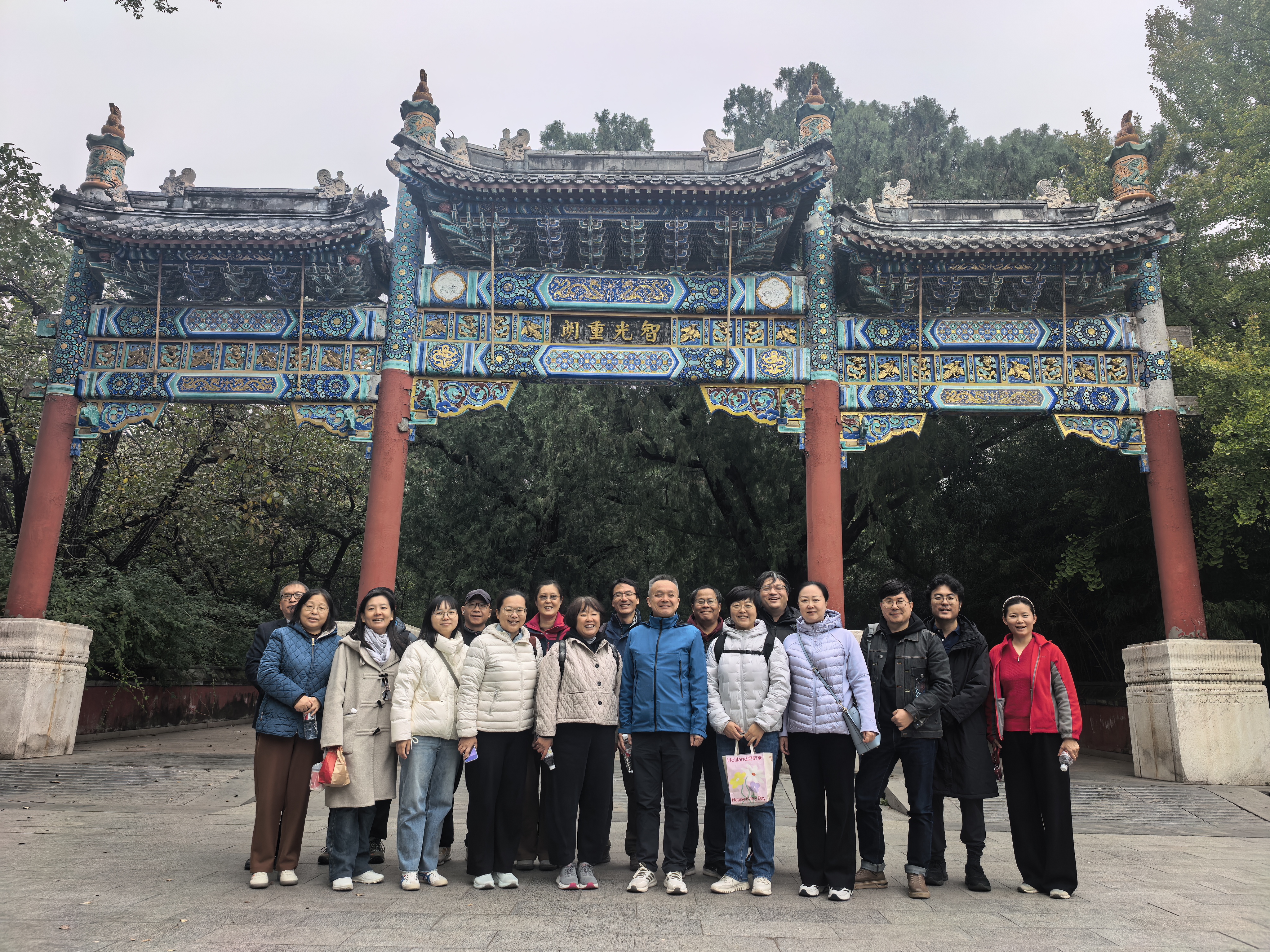 时值深秋,植物园内色彩斑斓,秋意正浓。活动当日,老师们从东南门入园,向北行进,首先探访了闻名遐迩的卧佛寺。寺前那棵古银杏树正值最佳观赏期,满树金黄与古寺的红墙黛瓦构成一幅静谧深远的古典画卷,让大家深刻感受到了北京秋日的历史底蕴。告别古寺,老师们信步至樱桃沟,漫步于栈道之上,欣赏水杉林染就的独特橙红,在静谧山谷中放松身心,畅叙友情。