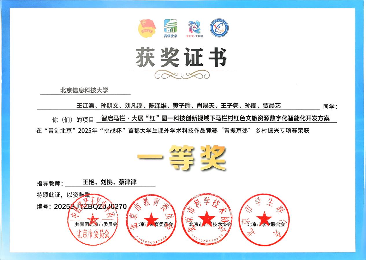 此次“大创”结题答辩充分体现了学院立足“大创”项目孵化培育更高学科竞赛成果的机制创新。在本次结题的项目中,王江溧同学依托《Z世代红色文化传承与文旅消费偏好调研》项目的研究成果,积极参加了“青创北京”首都大学生课外学术科技作品竞赛“青振京郊”乡村专项赛,并通过“揭榜挂帅”为“京西红色第一村”门头沟区斋堂镇马栏村提供了《智启马栏·大展‘红’图——科技创新视域下马栏村红色文旅资源数字化智能化开发方案》,最终荣获一等奖。