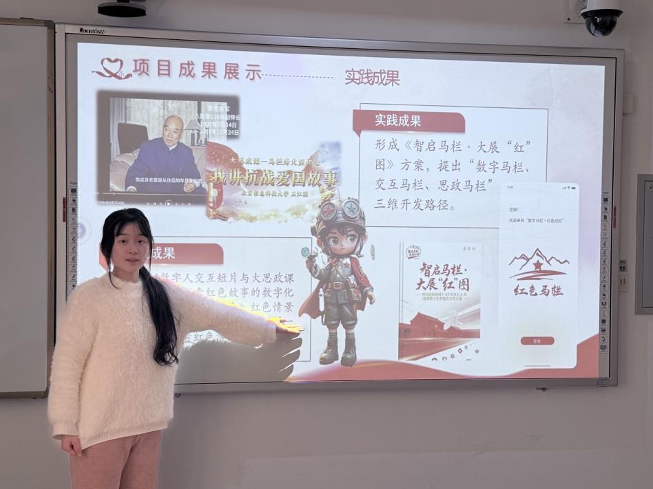 《Z世代红色文化传承与文旅消费偏好调研》项目由网媒2401王江溧同学带领团队完成,基于沉浸式体验视角,探索青年群体红色文化认同与文旅消费行为。项目以马栏村为核心案例,打造AI数字人“小栏星”,制作AI萧克将军与大学生对话视频及大思政课教育短片,构建“数字马栏、交互马栏、思政马栏”三维开发路径。团队积极探索了红色故事数字化表达与文旅融合传播。项目论文已发表,成果荣获2025年“青创北京”首都大学生课外学术科技作品竞赛“青振京郊”乡村专项赛一等奖。