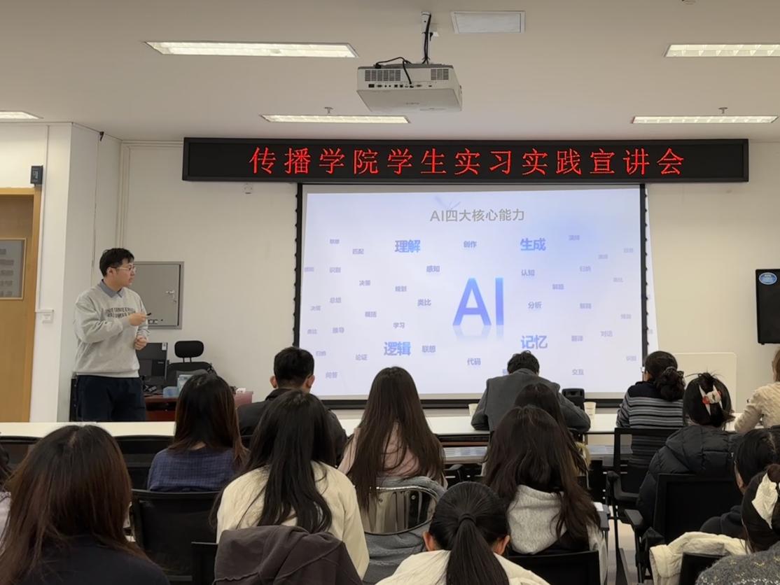为进一步提升和助力传播学院同学对人工智能前沿技术的了解和使用,加强学院与行业头部企业在科学研究、人才培养与课程共建等方面的沟通协作,11月14日下午,传播艺术与科学学院邀请百度高级市场经理徐梓茗开展AI专题宣讲。